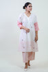 Indulge in sophistication with our A-line kurta featuring a captivating rose, polka dots, and lines print on handloom khadi. Intricately hand-embroidered with sequins, zari, pearls, and zardozi, this exquisite piece exudes elegance. For a chic ensemble, pair it with pink and white striped bottoms to enhance your overall look.