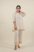 Paired with straight-cut pants edged in warm mustard and blue borders, this silhouette blends comfort with understated elegance. Lightweight, breathable, and versatile, it is designed for everyday ease while carrying the quiet luxury of craft.