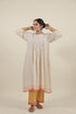 Graceful and artisanal, this ivory kurta set from the Kesar Collection brings together the elegance of Chikankari embroidery with the charm of hand-smocking. The yoke is detailed with delicate gathers, framed by floral threadwork in saffron and rose pink, lending a soft pop of color to the neutral base.