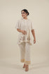 Designed with puff sleeves and scalloped lace edging, the tunic carries a romantic charm, balanced by the straight-cut pants finished with saffron and blue borders. Lightweight and breathable, this set is perfect for days that call for both ease and refinement.