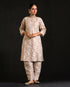 A classic handwoven silver tissue short kurta and straight pants features chikankari floral jaal, an ode to Awadh's Mughal era.The neutral tones and the beautiful fabric is a must have in your collection. Looks lovely as a co-ord set and can also be worn with a beautiful organza mukaish dupatta to complete the look of an Indian attire. (Odhani worn by the model is not included.)