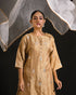 Our exclusive 'Merab' gold set with kamdani metallic embroidery brings a charm to the festive and wedding get togethers. The fabric is handwoven tissue silk. The handwoven organza silk mukaish dupatta can be added as a separate for a rich and a royal look(Odhani worn by the model is not included.)
