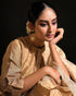 This exquisite golden striped dupatta with aari work and scallops all over is a timeless accessory that complements any outfit with its stunning beauty.